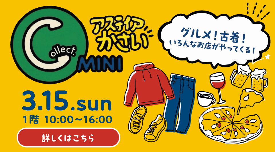 イベント アスティアかさい23周年祭 3Dアクアリウム上映会 イベント Collect.mini アスティアかさい お知らせ 外国語コミュニケーションクラス案内 無料レッスン受付中 イベント インド・バングラデシュ展、バングラディッシュキッチン ショップニュース カフェ*えん 期間限定メニュー トピックスをもっと見る ファッション・ファッション雑貨 食品・飲食 サービス・その他 クリニックエリア その他施設など Instagram でフォロー