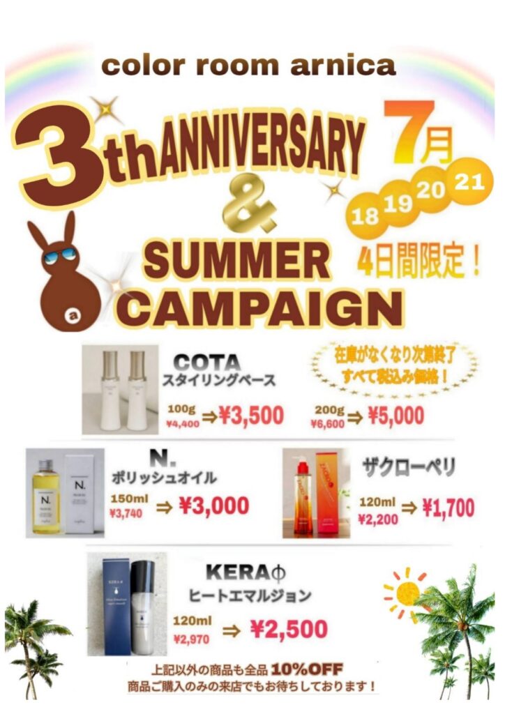 color room arnica フロア 1F カテゴリ サービス・その他/ヘアカラー専門店 営業時間 10:00~19:00(最終受付17:30) 定休日 第1・3木曜日 TEL 050-8884-6756 ウェブサイト color room arnica SNS 髪やお肌に優しいオーガニックカラーを使用手洗いシャンプー ご予約優先 ショップニュース